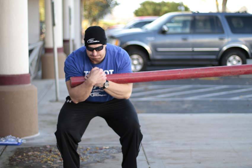 - With the weight loaded, take a zurcher hold on the end of the implement. Place the bar in the crook of the elbow and hold onto your wrist. Try to keep the weight off of the forearms.