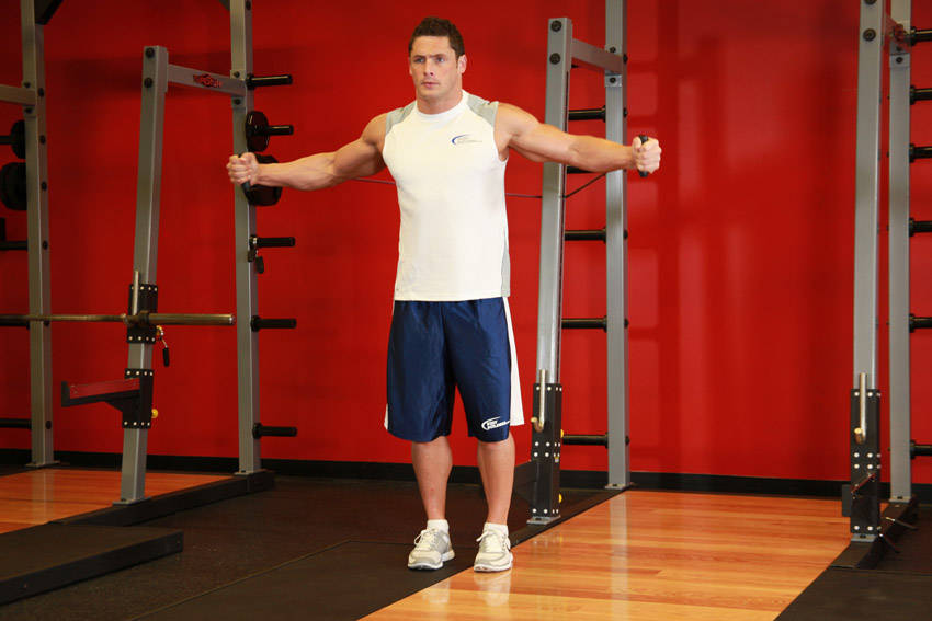 - While keeping your arms straight, bring them across your chest in a semicircular motion to the front as you exhale and flex your pecs. Hold the contraction for a second.