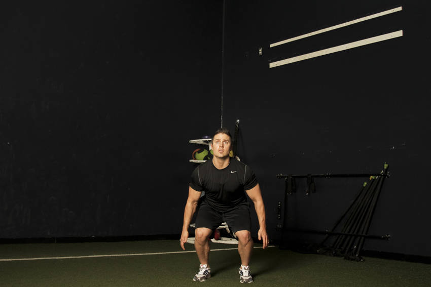 2. To initiate the move, squat down halfway and explode back up as high as possible.